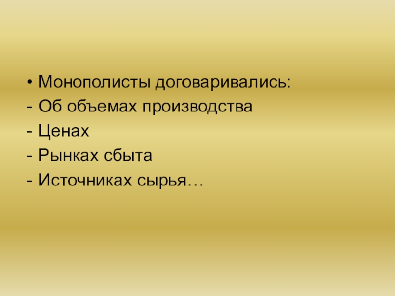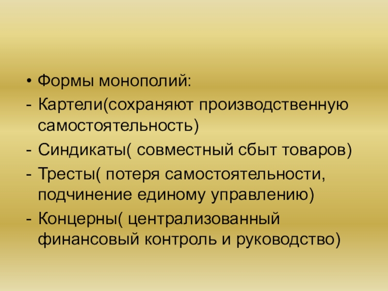 Картель — форма объединения фирм, компаний, банков, которые договариваются о размерах производства, рынках сбыта, ценах и т. д., сохраняя при этом производственную самостоятельность.