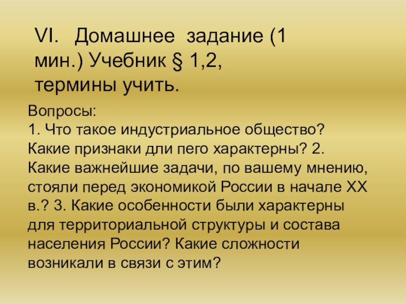 Что такое индустриальное общество? Какие признаки дли пего характерны? 2. Какие важнейшие задачи, по вашему мнению, стояли перед экономикой России в начале XX в.? 3. Какие особенности были характерны для территориальной структуры и состава населения России? Какие сложности возникали в связи с этим?