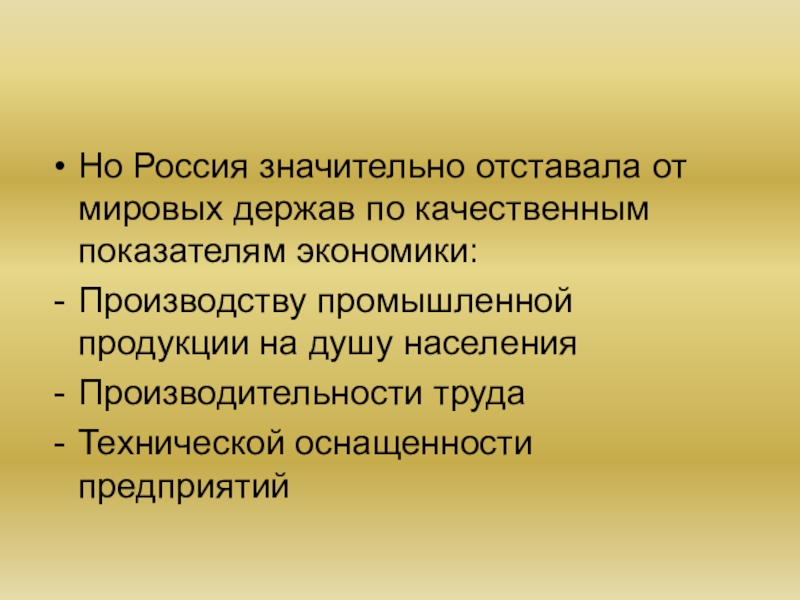 Но Россия значительно отставала от мировых держав по качественным показателям экономики: