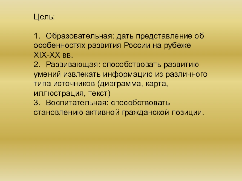 1. Образовательная: дать представление об особенностях развития России на рубеже XIX-XX