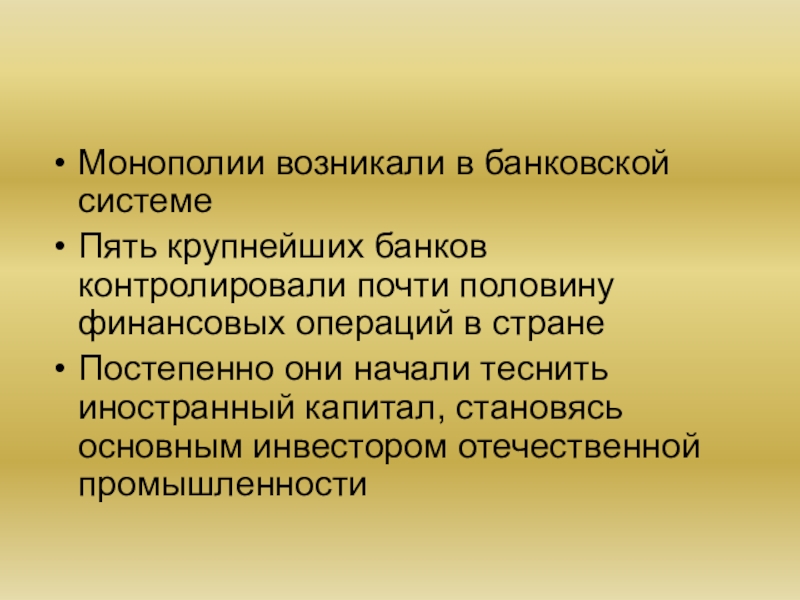 Постепенно они начали теснить иностранный капитал, становясь основным инвестором отечественной промышленности