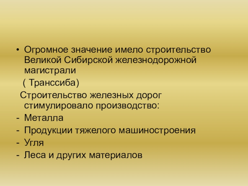 Огромное значение имело строительство Великой Сибирской железнодорожной магистрали