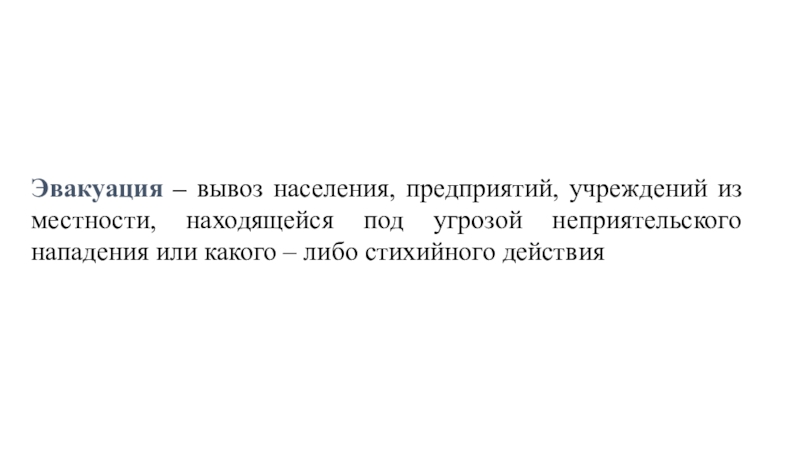 Слайд 24Эвакуация – вывоз населения, предприятий, учреждений из местности, находящейся под угрозой