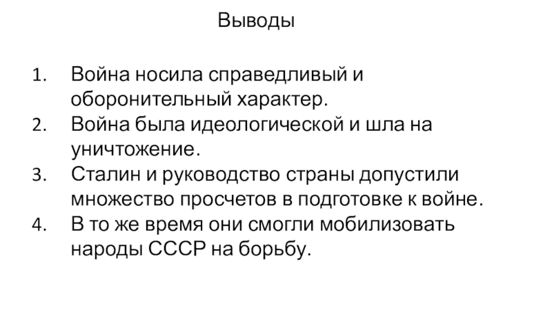 “На протяжении нескольких лет перед Отечественной войной советскому народу внушалось, что наша страна находится в постоянной готовности дать сокрушительный отпор любому агрессору. На все лады восхвалялись наша военная мощь, прививались народу опасные настроения легкости победы в будущей войне, торжественно заявлялось о том, что мы всегда готовы на удар врага ответить тройным ударом, что, несомненно, притупляло бдительность советского народа и не мобилизовало его на активную подготовку страны к обороне.