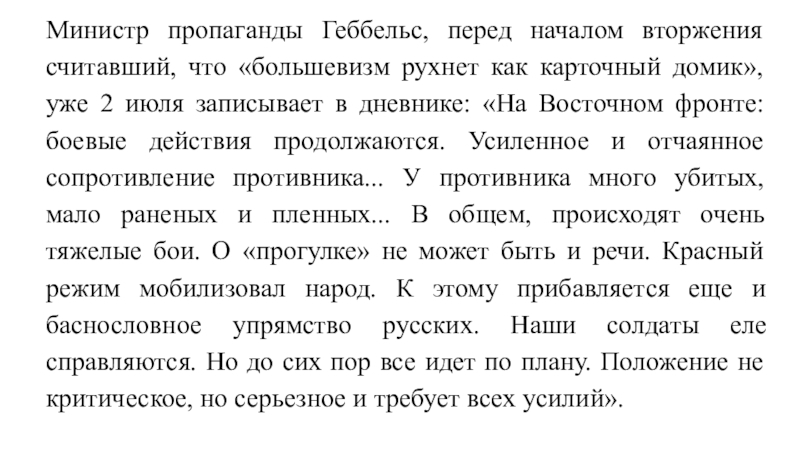 Слайд 18Министр пропаганды Геббельс, перед началом вторжения считавший, что «большевизм рухнет как