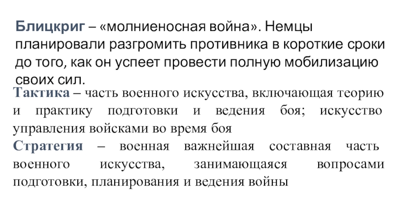 Слайд 16Блицкриг – «молниеносная война». Немцы планировали разгромить противника в короткие сроки
