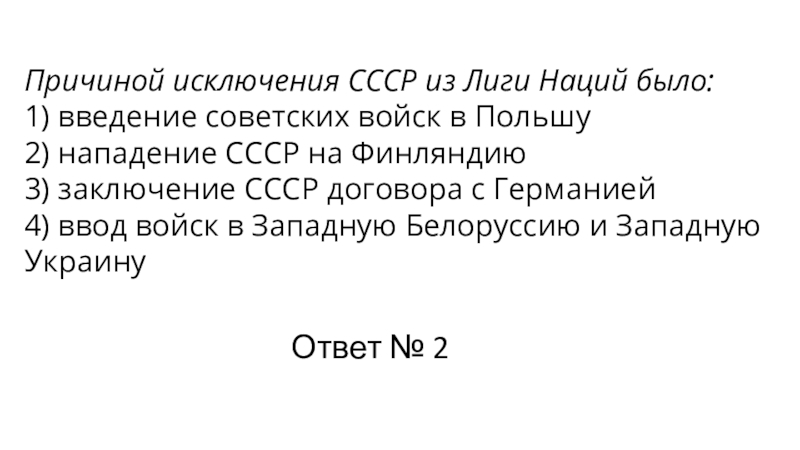 Слайд 4Причиной исключения СССР из Лиги Наций было: