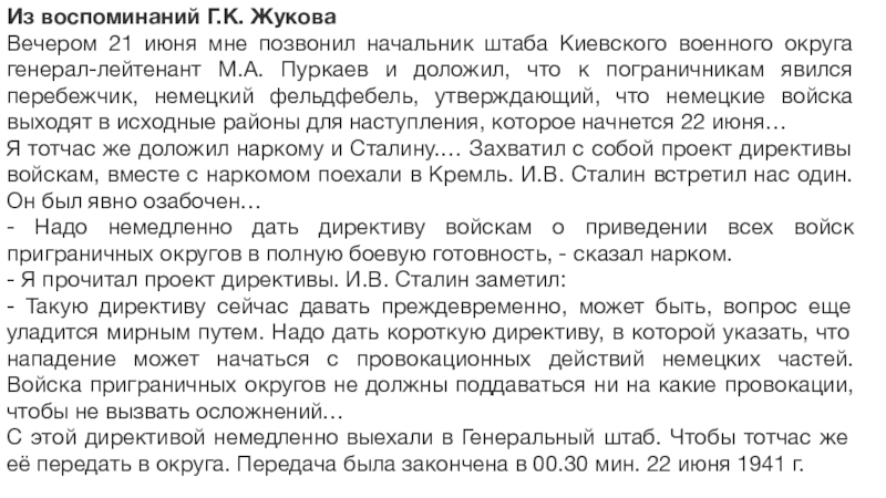 С этой директивой немедленно выехали в Генеральный штаб. Чтобы тотчас же её передать в округа. Передача была закончена в 00.30 мин. 22 июня 1941 г.
