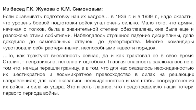 …То, как трактуют внезапность сейчас, да и как трактовал её в свое время Сталин, - неправильно, неполно и однобоко. Главная опасность заключалась не в том что, немцы перешли границу, а в том, что для нас оказалось неожиданностью их шестикратное и восьмикратное превосходство в силах на решающих направлениях; для нас оказались неожиданностью и масштабы сосредоточения их войск, и сила их удара. Это и есть главное, что предопределило наши потери первого периода войны.