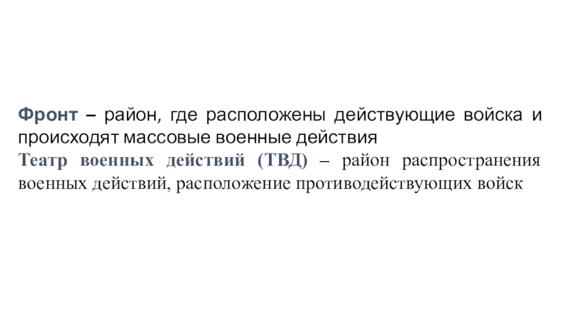 Слайд 20Фронт – район, где расположены действующие войска и происходят массовые военные