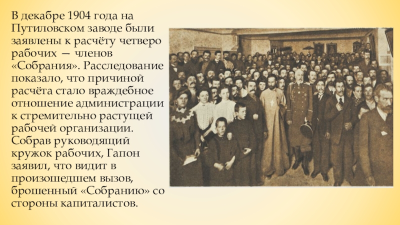 четверо рабочих — членов «Собрания». Расследование показало, что причиной расчёта стало враждебное отношение администрации к стремительно растущей рабочей организации. Собрав руководящий кружок рабочих, Гапон заявил, что видит в произошедшем вызов, брошенный «Собранию» со стороны капиталистов.