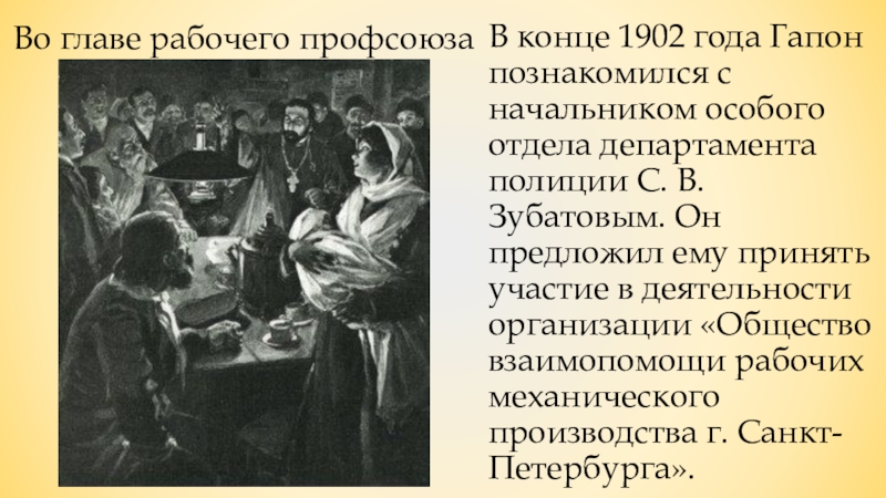 особого отдела департамента полиции С. В. Зубатовым. Он предложил ему принять участие в деятельности организации «Общество взаимопомощи рабочих механического производства г. Санкт-Петербурга».