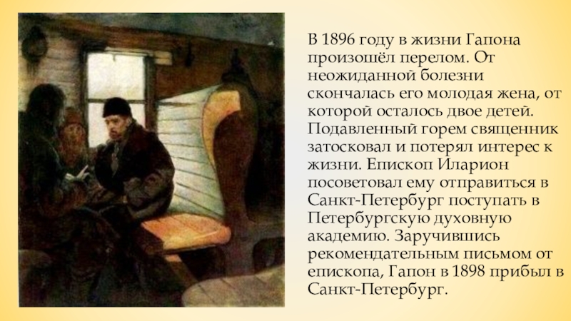 Слайд 3В 1896 году в жизни Гапона произошёл перелом. От неожиданной болезни
