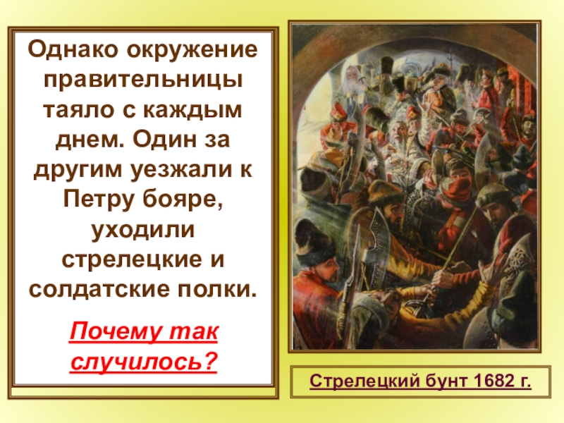 Однако окружение правительницы таяло с каждым днем. Один за другим уезжали к Петру бояре, уходили стрелецкие и солдатские полки.