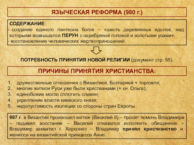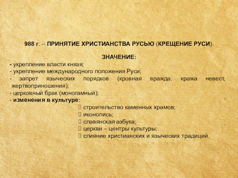 987 г. в Византии произошел мятеж (Василий II) – просит помочь Владимира – подавил восстание – Василий отказался исполнять обещанное – Владимир захватил г. Херсонес – Владимир принял христианство и женился на византийской принцессе Анне.