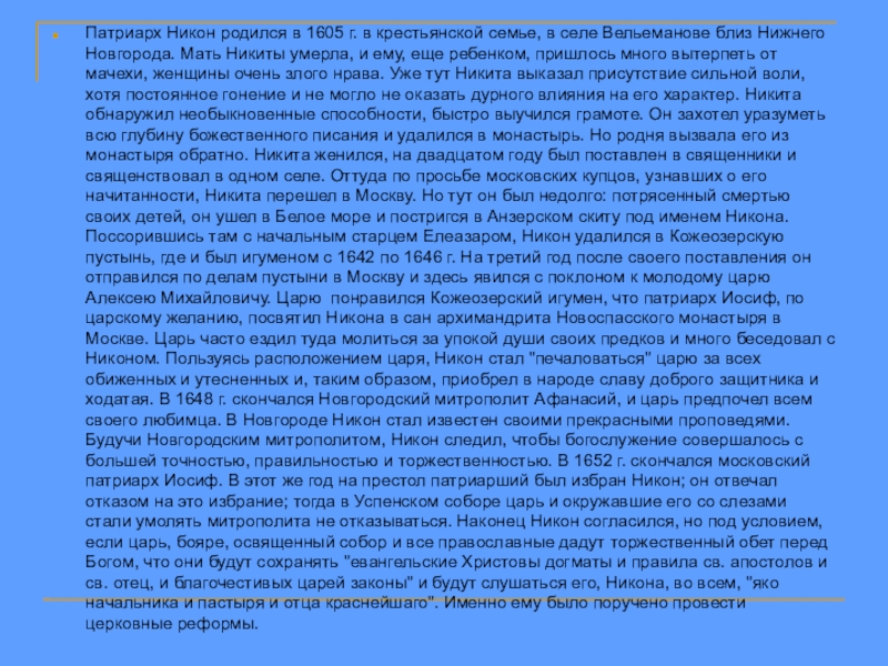 Вельеманове близ Нижнего Новгорода. Мать Никиты умерла, и ему, еще ребенком, пришлось много вытерпеть от мачехи, женщины очень злого нрава. Уже тут Никита выказал присутствие сильной воли, хотя постоянное гонение и не могло не оказать дурного влияния на его характер. Никита обнаружил необыкновенные способности, быстро выучился грамоте. Он захотел уразуметь всю глубину божественного писания и удалился в монастырь. Но родня вызвала его из монастыря обратно. Никита женился, на двадцатом году был поставлен в священники и священствовал в одном селе. Оттуда по просьбе московских купцов, узнавших о его начитанности, Никита перешел в Москву. Но тут он был недолго: потрясенный смертью своих детей, он ушел в Белое море и постригся в Анзерском скиту под именем Никона. Поссорившись там с начальным старцем Елеазаром, Никон удалился в Кожеозерскую пустынь, где и был игуменом с 1642 по 1646 г. На третий год после своего поставления он отправился по делам пустыни в Москву и здесь явился с поклоном к молодому царю Алексею Михайловичу. Царю понравился Кожеозерский игумен, что патриарх Иосиф, по царскому желанию, посвятил Никона в сан архимандрита Новоспасского монастыря в Москве. Царь часто ездил туда молиться за упокой души своих предков и много беседовал с Никоном. Пользуясь расположением царя, Никон стал "печаловаться" царю за всех обиженных и утесненных и, таким образом, приобрел в народе славу доброго защитника и ходатая. В 1648 г. скончался Новгородский митрополит Афанасий, и царь предпочел всем своего любимца. В Новгороде Никон стал известен своими прекрасными проповедями. Будучи Новгородским митрополитом, Никон следил, чтобы богослужение совершалось с большей точностью, правильностью и торжественностью. В 1652 г. скончался московский патриарх Иосиф. В этот же год на престол патриарший был избран Никон; он отвечал отказом на это избрание; тогда в Успенском соборе царь и окружавшие его со слезами стали умолять митрополита не отказываться. Наконец Никон согласился, но под условием, если царь, бояре, освященный собор и все православные дадут торжественный обет перед Богом, что они будут сохранять "евангельские Христовы догматы и правила св. апостолов и св. отец, и благочестивых царей законы" и будут слушаться его, Никона, во всем, "яко начальника и пастыря и отца краснейшаго". Именно ему было поручено провести церковные реформы.