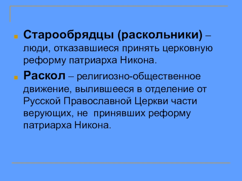 Слайд 20Старообрядцы (раскольники) – люди, отказавшиеся принять церковную реформу патриарха Никона.