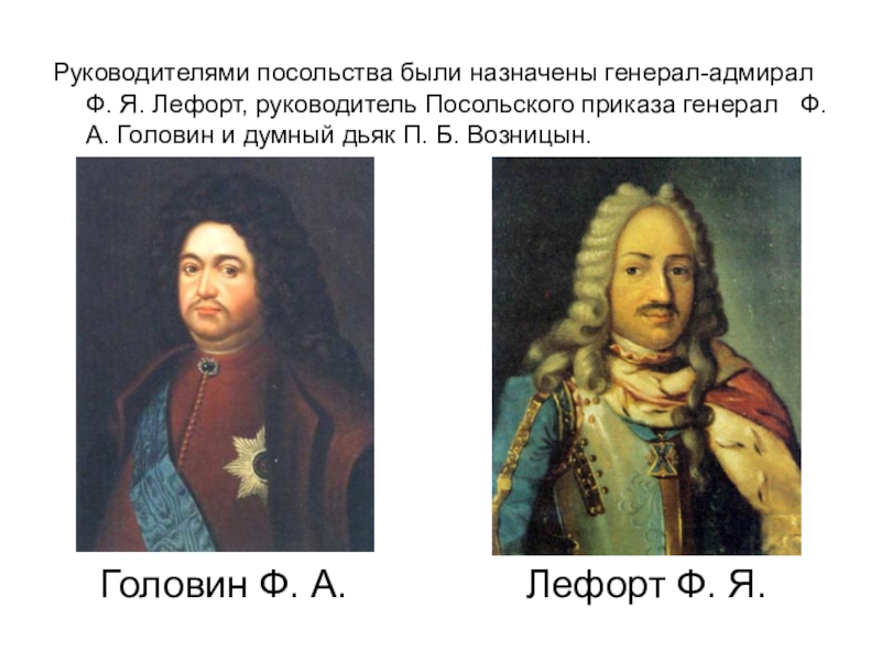 Слайд 21Руководителями посольства были назначены генерал-адмирал Ф. Я. Лефорт, руководитель Посольского приказа