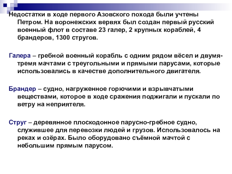 Слайд 17Недостатки в ходе первого Азовского похода были учтены Петром. На воронежских