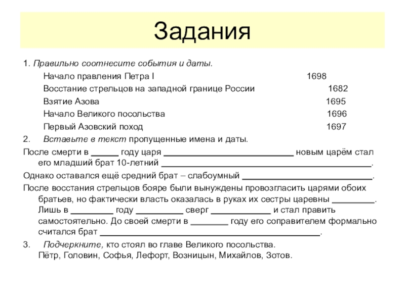 Пётр, Головин, Софья, Лефорт, Возницын, Михайлов, Зотов.