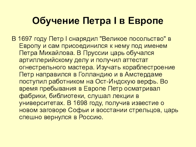 посольство" в Европу и сам присоединился к нему под именем Петра Михайлова. В Пруссии царь обучался артиллерийскому делу и получил аттестат огнестрельного мастера. Изучать кораблестроение Петр направился в Голландию и в Амстердаме поступил работником на Ост-Индскую верфь. Во время пребывания в Европе Петр осматривал фабрики, библиотеки, слушал лекции в университетах. В 1698 году, получив известие о новом заговоре Софьи и восстании стрельцов, царь спешно вернулся в Россию.