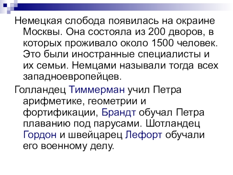 Голландец Тиммерман учил Петра арифметике, геометрии и фортификации, Брандт обучал Петра плаванию под парусами. Шотландец Гордон и швейцарец Лефорт обучали его военному делу.