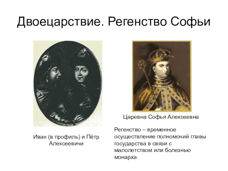 После восстания стрельцов бояре были вынуждены провозгласить царями обоих братьев, но фактически власть оказалась в руках их сестры царевны . Лишь в году сверг и стал править самостоятельно. До своей смерти в году его соправителем формально считался брат .