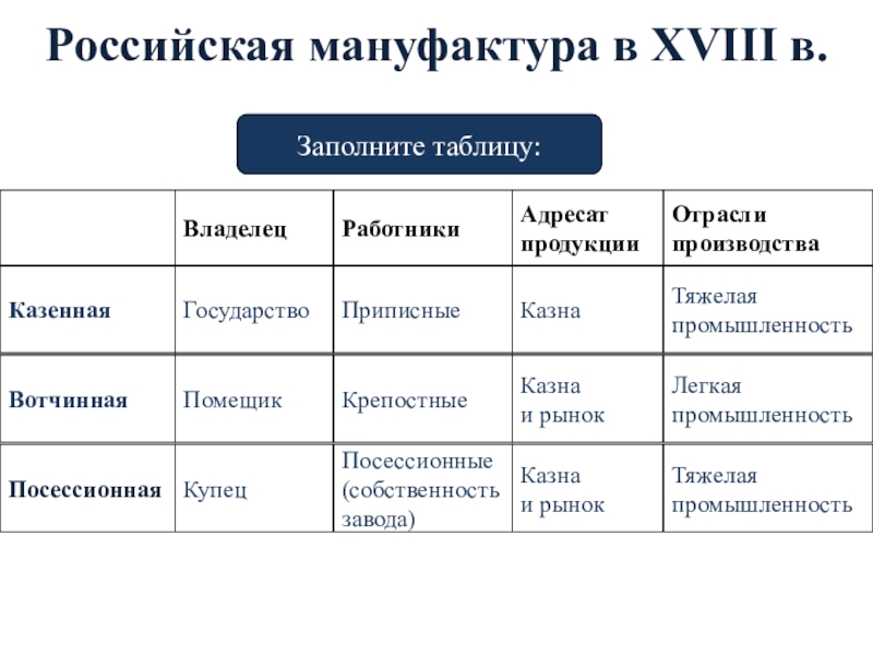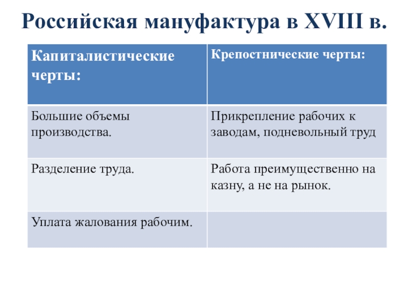 Мануфактура - большое предприятие, где в основном применялся ручной труд наёмных рабочих и широко использовалось разделение труда.