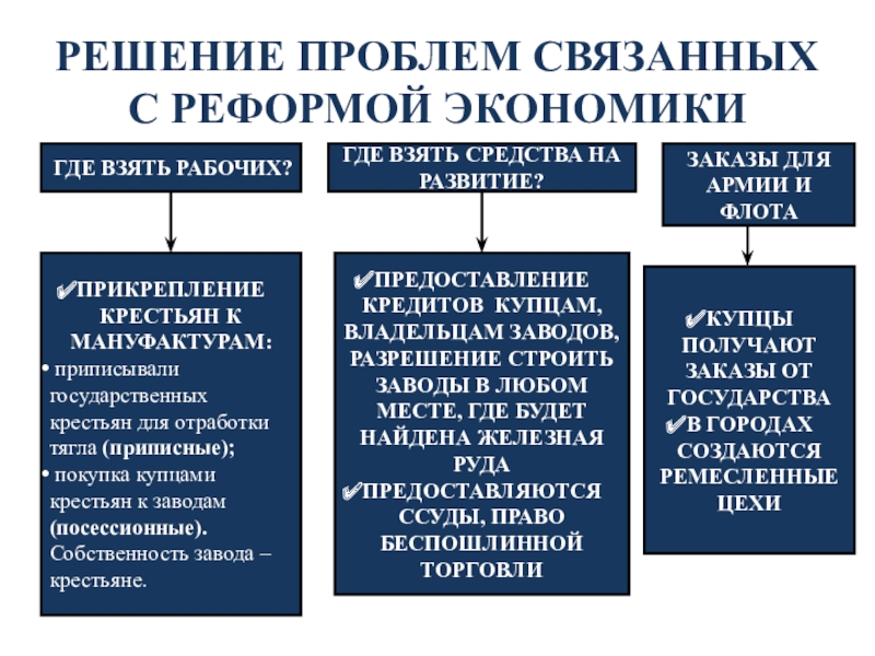 покупка купцами крестьян к заводам (посессионные). Собственность завода – крестьяне.