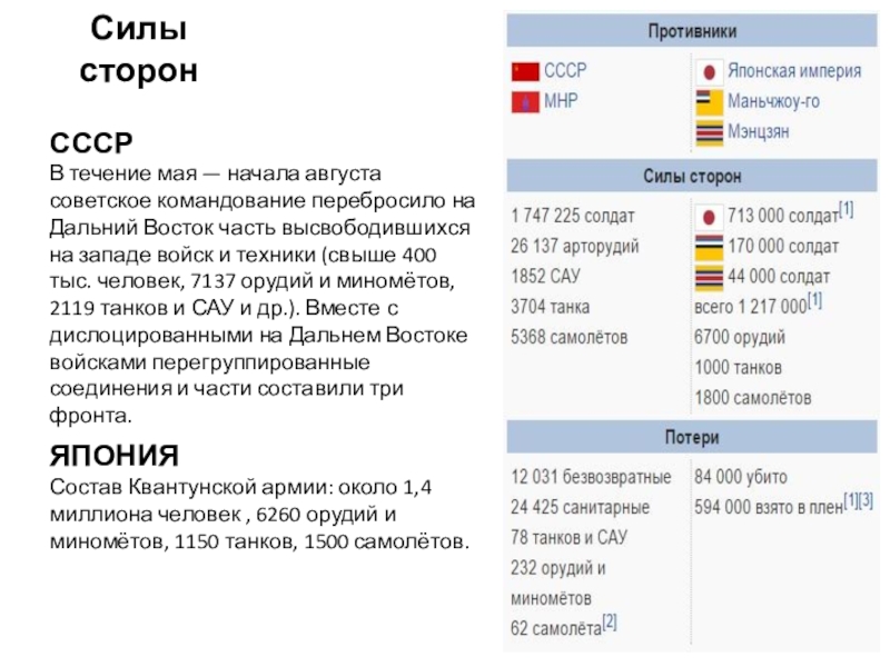 Состав Квантунской армии: около 1,4 миллиона человек , 6260 орудий и миномётов, 1150 танков, 1500 самолётов.