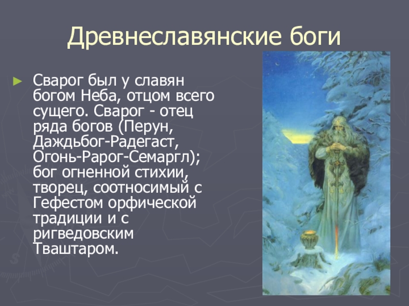 - отец ряда богов (Перун, Даждьбог-Радегаст, Огонь-Рарог-Семаргл); бог огненной стихии, творец, соотносимый с Гефестом орфической традиции и с ригведовским Тваштаром.