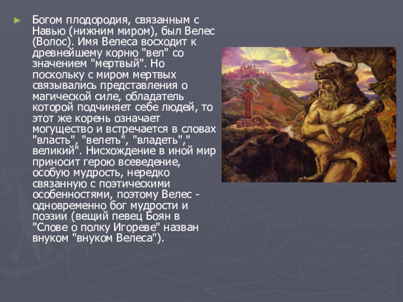 Слайд 7Богом плодородия, связанным с Навью (нижним миром), был Велес (Волос). Имя