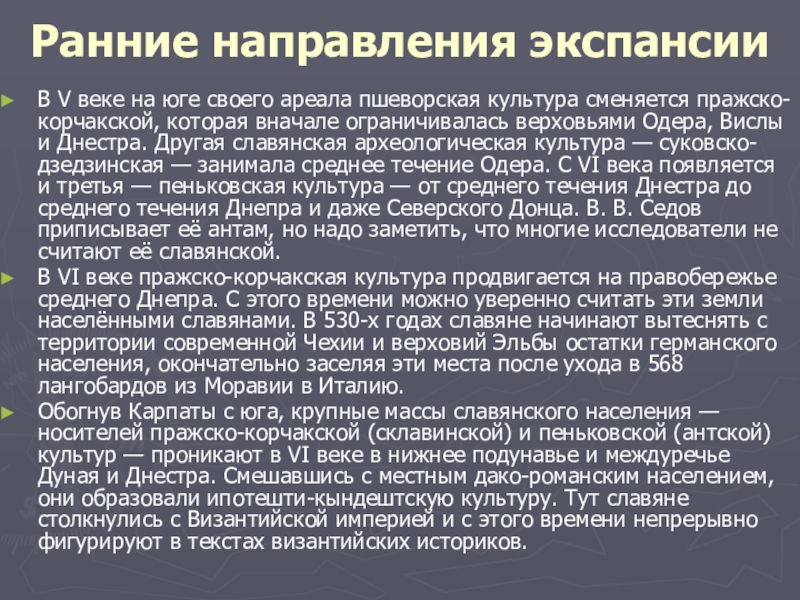 сменяется пражско-корчакской, которая вначале ограничивалась верховьями Одера, Вислы и Днестра. Другая славянская археологическая культура — суковско-дзедзинская — занимала среднее течение Одера. С VI века появляется и третья — пеньковская культура — от среднего течения Днестра до среднего течения Днепра и даже Северского Донца. В. В. Седов приписывает её антам, но надо заметить, что многие исследователи не считают её славянской.