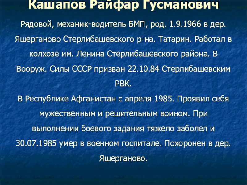 Рядовой, механик-водитель БМП, род. 1.9.1966 в дер. Яшерганово Стерлибашевского