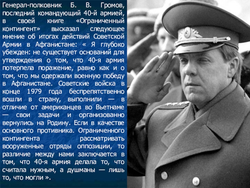 Слайд 15Генерал-полковник Б. В. Громов, последний командующий 40-й армией, в своей книге