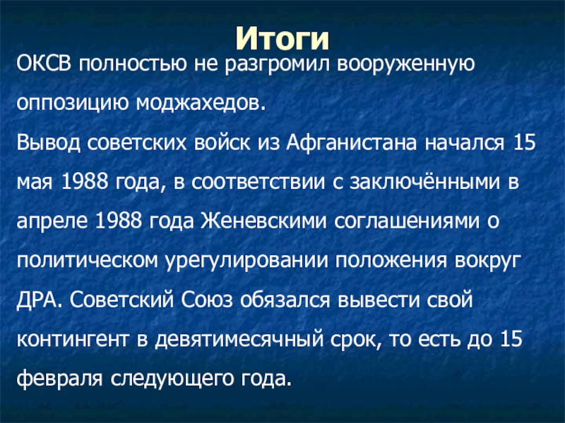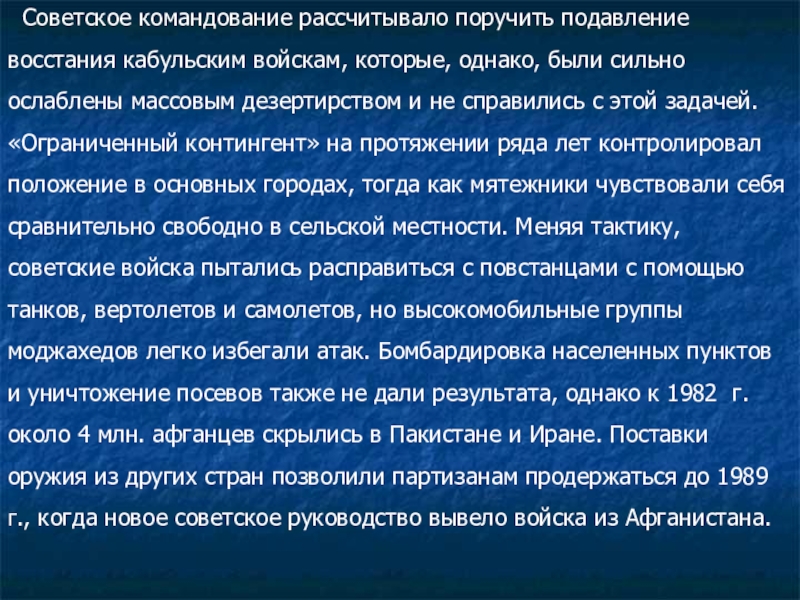 были сильно ослаблены массовым дезертирством и не справились с этой задачей. «Ограниченный контингент» на протяжении ряда лет контролировал положение в основных городах, тогда как мятежники чувствовали себя сравнительно свободно в сельской местности. Меняя тактику, советские войска пытались расправиться с повстанцами с помощью танков, вертолетов и самолетов, но высокомобильные группы моджахедов легко избегали атак. Бомбардировка населенных пунктов и уничтожение посевов также не дали результата, однако к 1982 г. около 4 млн. афганцев скрылись в Пакистане и Иране. Поставки оружия из других стран позволили партизанам продержаться до 1989 г., когда новое советское руководство вывело войска из Афганистана.