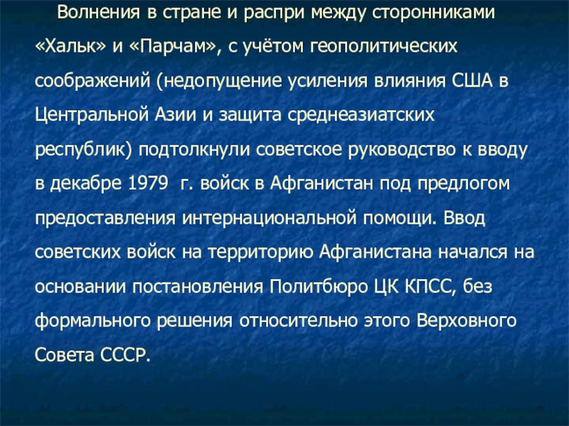 учётом геополитических соображений (недопущение усиления влияния США в Центральной Азии и защита среднеазиатских республик) подтолкнули советское руководство к вводу в декабре 1979 г. войск в Афганистан под предлогом предоставления интернациональной помощи. Ввод советских войск на территорию Афганистана начался на основании постановления Политбюро ЦК КПСС, без формального решения относительно этого Верховного Совета СССР.