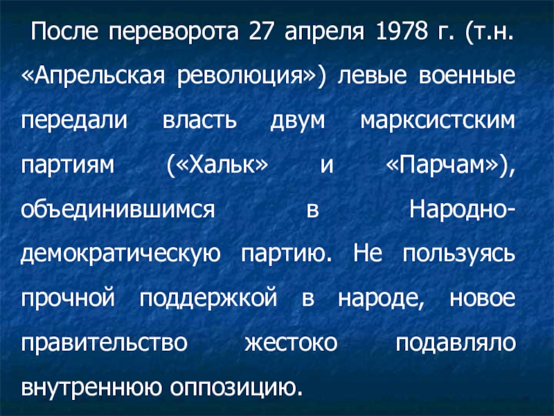 военные передали власть двум марксистским партиям («Хальк» и «Парчам»), объединившимся в Народно-демократическую партию. Не пользуясь прочной поддержкой в народе, новое правительство жестоко подавляло внутреннюю оппозицию.