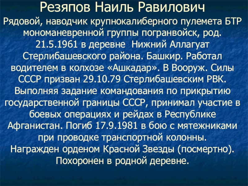 Башкир. Работал в колхозе им. Ленина. В вооруж. Силы СССР призван 18.11.87 Стерлибашевским РВК.