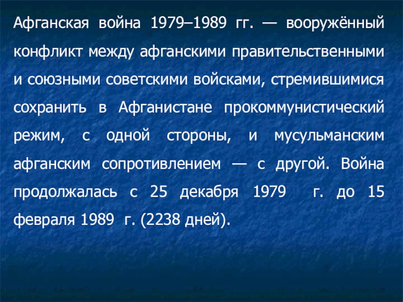 союзными советскими войсками, стремившимися сохранить в Афганистане прокоммунистический режим, с одной стороны, и мусульманским афганским сопротивлением — с другой. Война продолжалась с 25 декабря 1979 г. до 15 февраля 1989 г. (2238 дней).