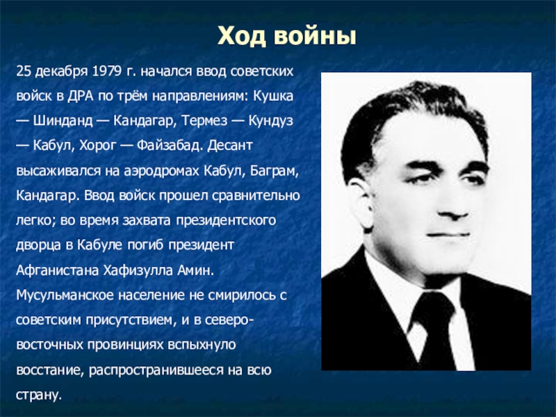 ДРА по трём направлениям: Кушка — Шинданд — Кандагар, Термез — Кундуз — Кабул, Хорог — Файзабад. Десант высаживался на аэродромах Кабул, Баграм, Кандагар. Ввод войск прошел сравнительно легко; во время захвата президентского дворца в Кабуле погиб президент Афганистана Хафизулла Амин. Мусульманское население не смирилось с советским присутствием, и в северо-восточных провинциях вспыхнуло восстание, распространившееся на всю страну.