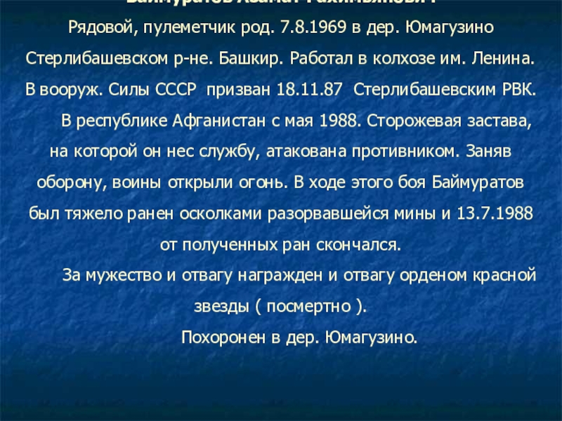 Рядовой, пулеметчик род. 7.8.1969 в дер. Юмагузино Стерлибашевском р-не.
