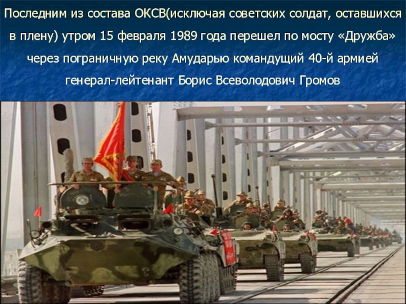 февраля 1989 года перешел по мосту «Дружба» через пограничную реку Амударью командущий 40-й армией генерал-лейтенант Борис Всеволодович Громов