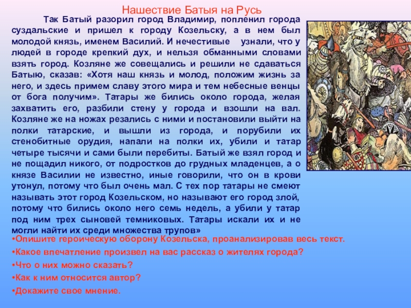Опишите героическую оборону Козельска, проанализировав весь текст.
