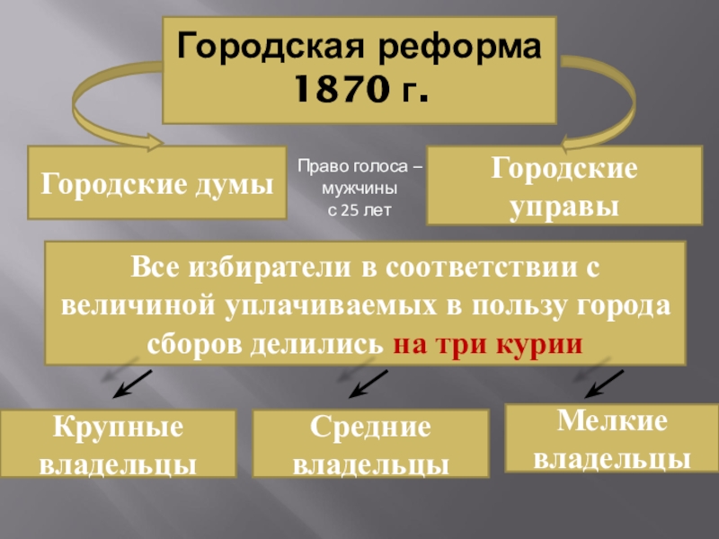 Все избиратели в соответствии с величиной уплачиваемых в пользу города сборов делились на три курии