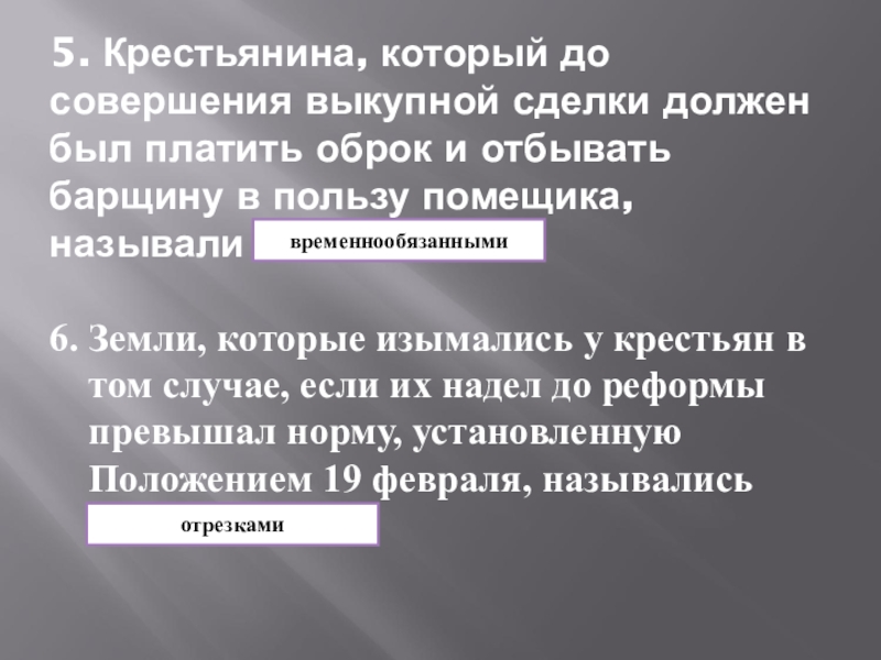 6. Земли, которые изымались у крестьян в том случае, если их надел до реформы превышал норму, установленную Положением 19 февраля, назывались _______________