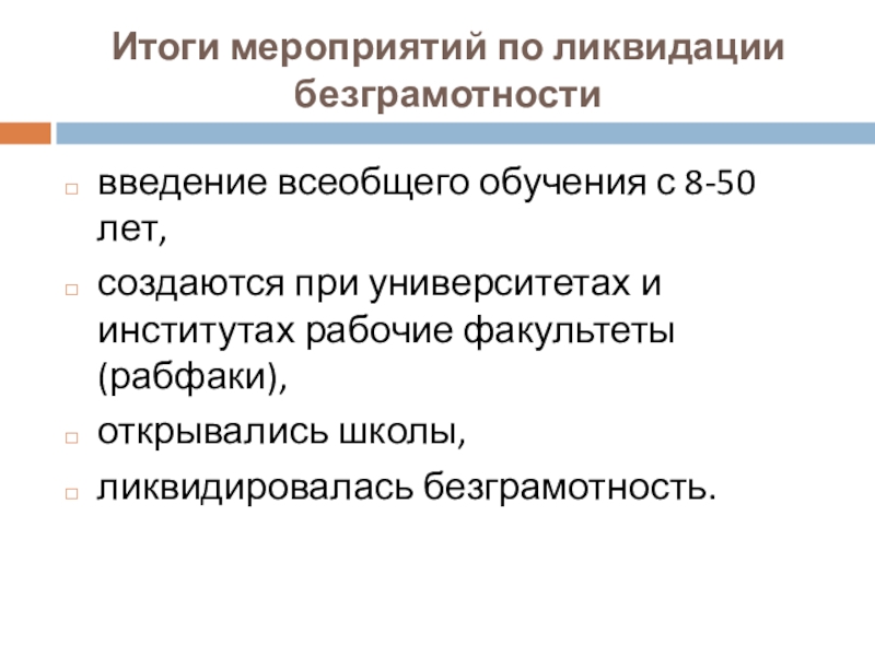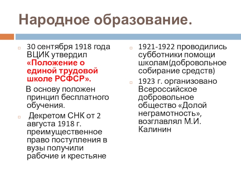 1923 г. организовано Всероссийское добровольное общество «Долой неграмотность», возглавлял М.И.Калинин