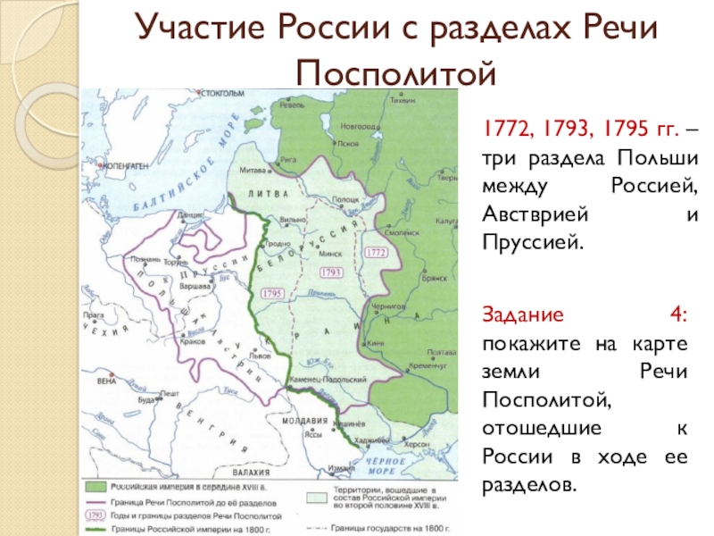 1772, 1793, 1795 гг. – три раздела Польши между Россией, Австврией и Пруссией.