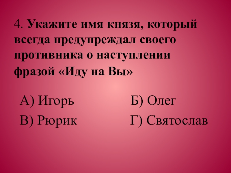 Слайд 224. Укажите имя князя, который всегда предупреждал своего противника о наступлении