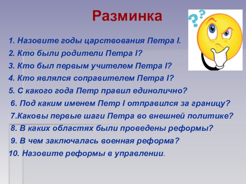 1. Назовите годы царствования Петра I.